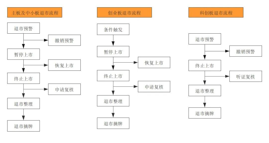 新《证券法》及科创版相关规定中取消了“暂停上市”和“恢复上市”的退市程序,更加遵循“退市从严”理念,一家企业从被实施风险警示到最终退市的时间从目前主板、中小板、创业板需要的四年缩短至两年,更不允许“重新上市”。