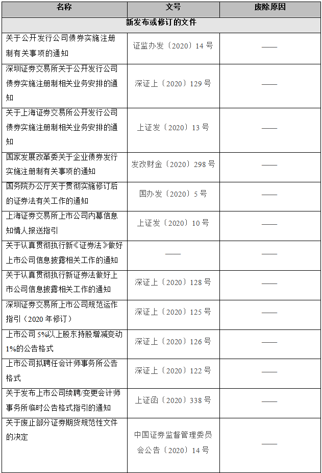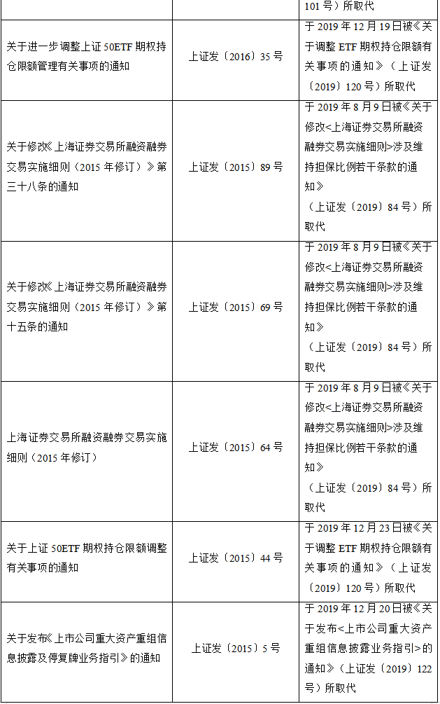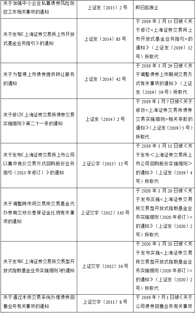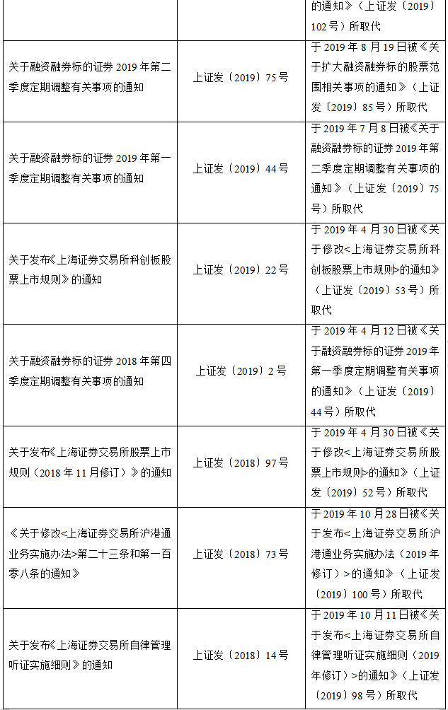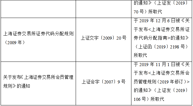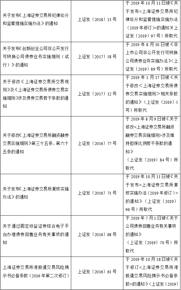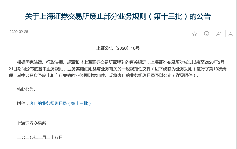 2020年2月28日,上海证券交易所发布关于废止部分业务规则(第十三批)的公告,完成对现行业务规则体系的系统性清理,集中废止30余件具体业务规则,其中包含与新《证券法》不相适应的相关规定。