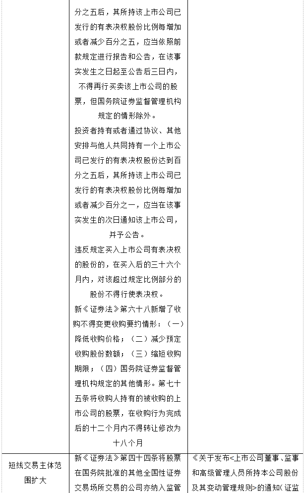 新《证券法》在“上市公司的收购”章节中对通过证券交易所进行证券交易的投资者权益变动涉及要求进行修订,《信息披露通知》规定,投资者持有或者通过协议、其他安排与他人共同持有一个上市公司已发行的有表决权股份达到百分之五后,其所持该上市公司已发行的有表决权股份比例每增加或者减少百分之五,应当依照前款规定进行报告和公告,在该事实发生之日起至公告后三日内,不得再行买卖该上市公司的股票,但国务院证券监督管理机构规定的情形除外。投资者持有或者通过协议、其他安排与他人共同持有一个上市公司已发行的有表决权股份达到百分之五后,其所持该上市公司已发行的有表决权股份比例每增加或者减少百分之一,应当在该事实发生的次日通知该上市公司,并予公告。