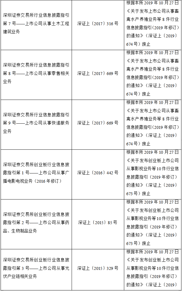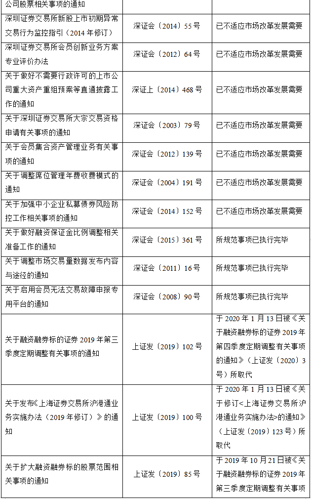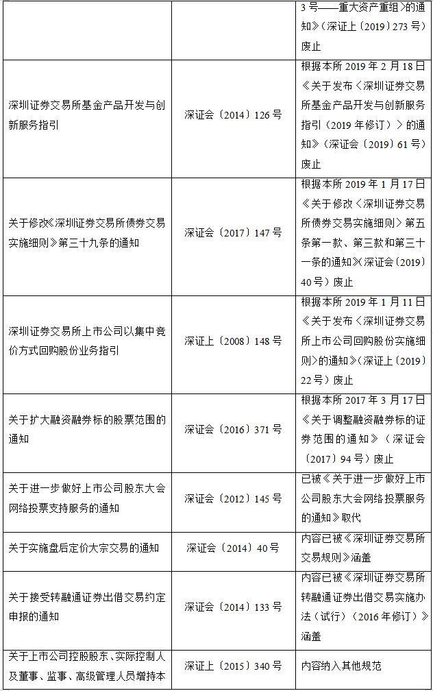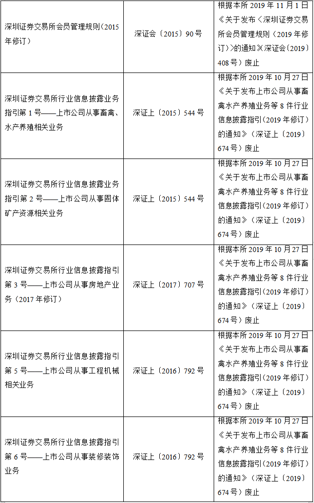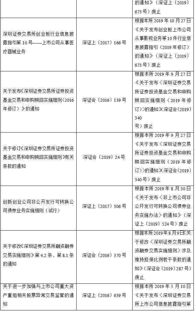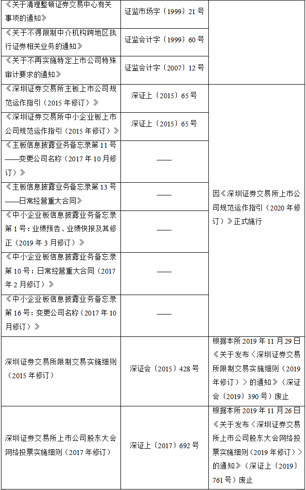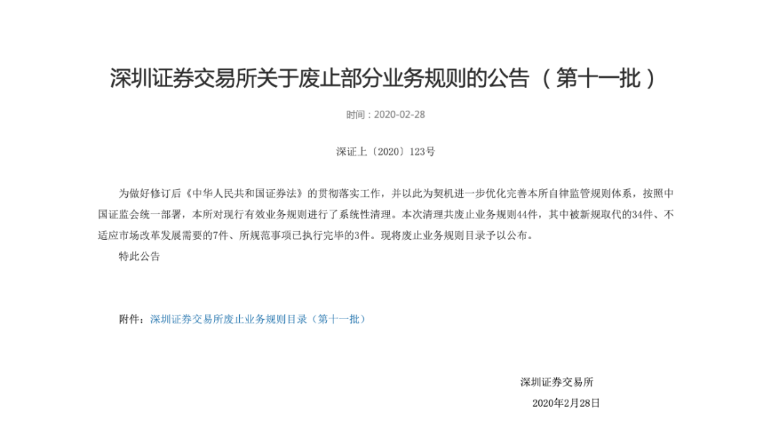 2020年2月28日,深圳证券交易所发布关于废止部分业务规则的公告,对现行有效业务规则进行了系统性清理。本次清理共废止业务规则44件,其中已被新规取代的33件、不适应市场改革发展需要的8件、所规范事项已执行完毕的3件。