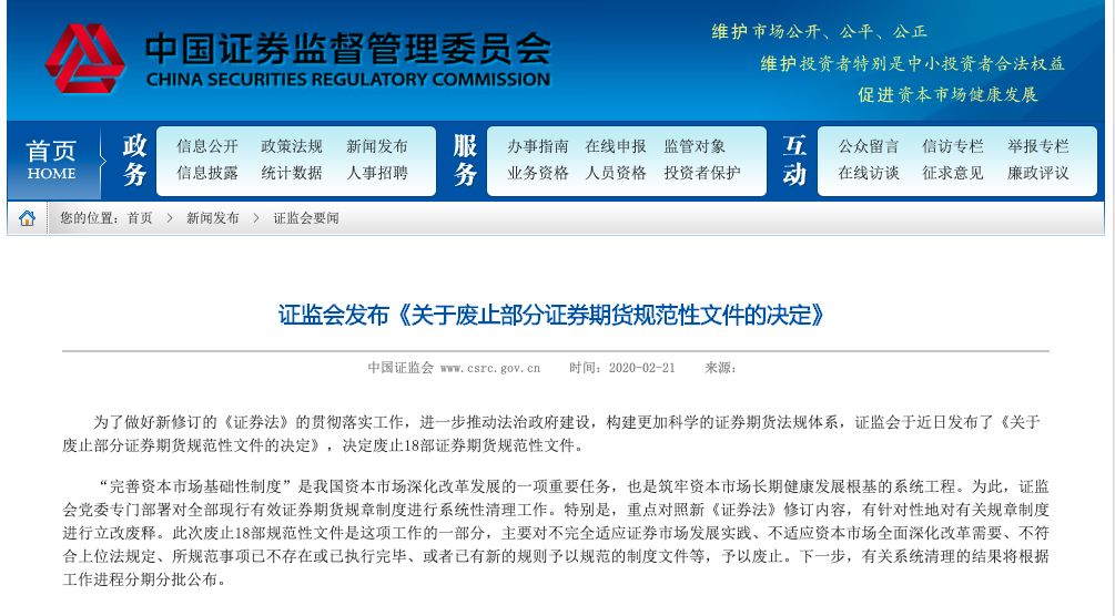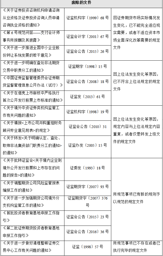 为了做好新修订的《证券法》的贯彻落实工作以及适应全面深化资本市场改革需要,中国证监会对有关规章、规范性文件进行了清理,决定对十八部规范性文件予以废止。
