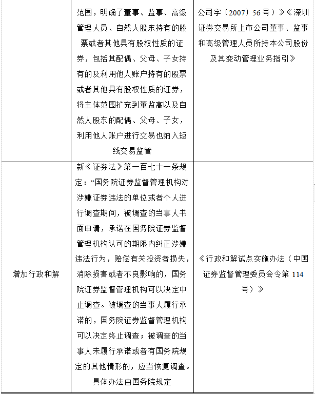 本次新《证券法》的出台,在构成短线交易方面,由原先规定适用情形仅为上市公司新增了股票在国务院批准的其他全国性证券交易场所交易的公司,同时扩大了主体范围,即董事、监事、高级管理人员、自然人股东持有的股票或者其他具有股权性质的证券,包括其配偶、父母、子女持有的及利用他人账户持有的股票或者其他具有股权性质的证券。