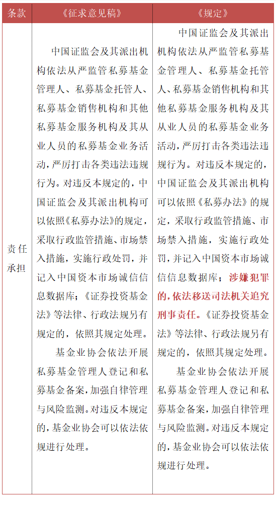 本条为违反《规定》的后果承担,相较于《征求意见稿》增加了刑事承担责任。通过该条实现了行政监管与自律规则的联动性,完善私募基金监管体系,实现多个维度的统一。