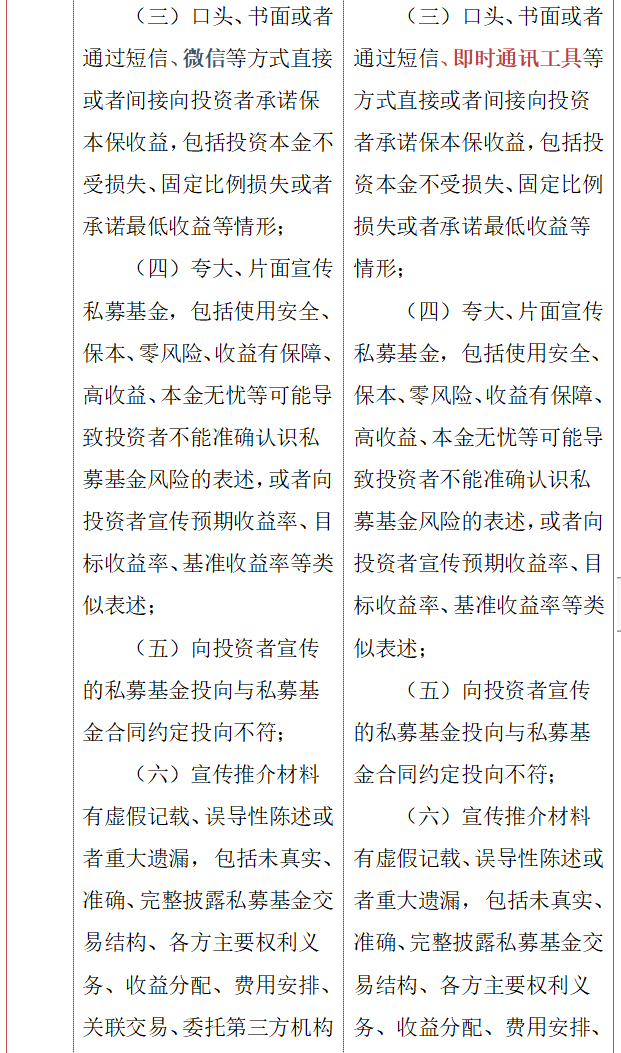 《规定》第六条与《征求意见稿》内容相比做了如下改动,一是将微信改为即时通讯工具;二是考虑到部分私募机构关联方较多,因此在宣传推介材料中删除了关联方的情况介绍;三是明确私募基金管理人不得管理未备案的基金,违反该点的私募基金管理人应当自《规定》施行之日六个月完成整改,整改期内暂停新增私募基金募集和备案。